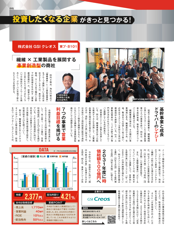 2025年10月21日発売の『日経マネー』2025年12月号において、「中計から紐解く、イチオシ企業大特集」ページ(87ページ)に当社の記事が掲載されました。 本記事では、繊維×工業製品を展開する“事業創造型商社”として、当社の事業内容や業績データ、中期経営計画の内容など、詳しくご紹介いただいております。 ぜひご覧ください。